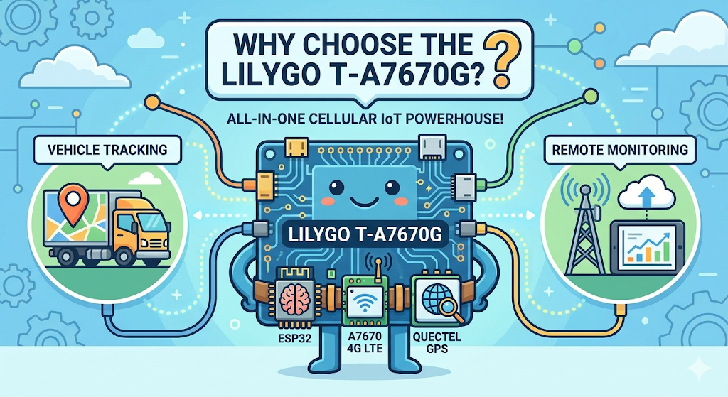 Are you looking for an all-in-one solution for your next cellular IoT project? Today, we are experimenting with a highly capable board: the LILYGO T-A7670G. This module integrates an ESP32, an A7670 4G LTE GSM module, and a dedicated Quectel GPS module onto a single PCB, making it a powerhouse for vehicle tracking and remote monitoring applications.