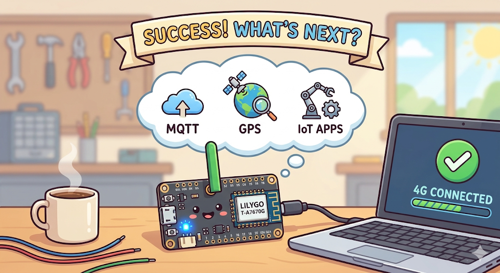 Congratulations! You have successfully powered up your LILYGO T-A7670G and established a stable 4G network connection. By using an integrated board, we've bypassed the common power and wiring headaches of older 2G modules, giving us a clean and reliable foundation for our projects.