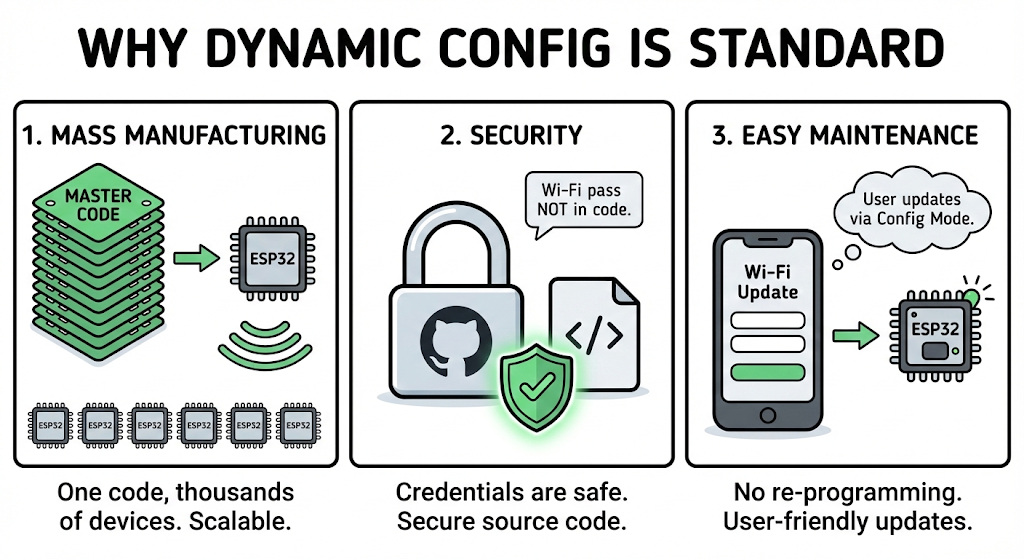 - Mass Manufacturing: You can flash the exact same code to 1,000 devices. You don't need to know the customer's Wi-Fi password beforehand.