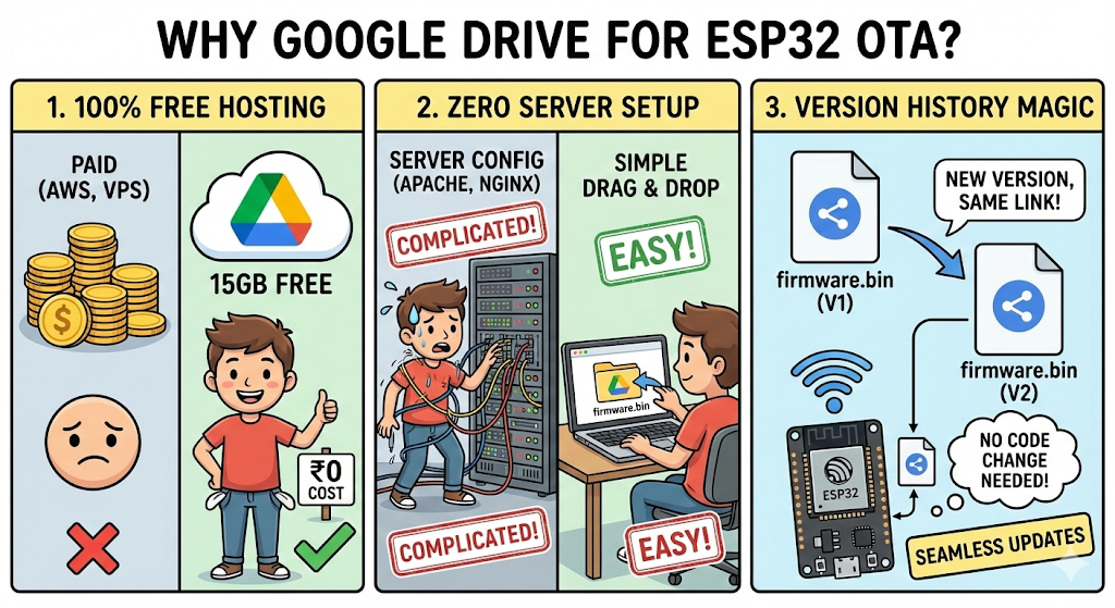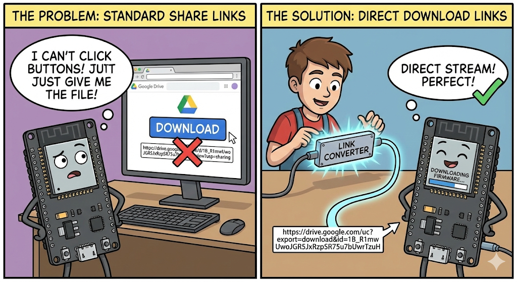 Typically, hosting OTA files requires setting up a web server or using paid cloud storage like AWS S3. But for hobbyists and makers, there is a fantastic, free alternative: Google Drive.