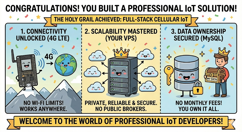 Most beginners stop at blinking an LED or sending data to a local Wi-Fi server. By completing this guide, you have stepped into the world of Professional IoT. You have solved the three biggest challenges in the industry: