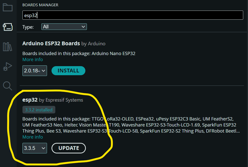 esp32. - You will see "esp32 by Espressif Systems". Click the Install button.