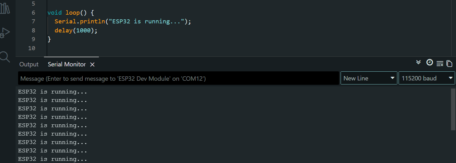 - Once uploaded, open the Serial Monitor (Top right corner), set the baud rate to 115200, and you should see the message printing!