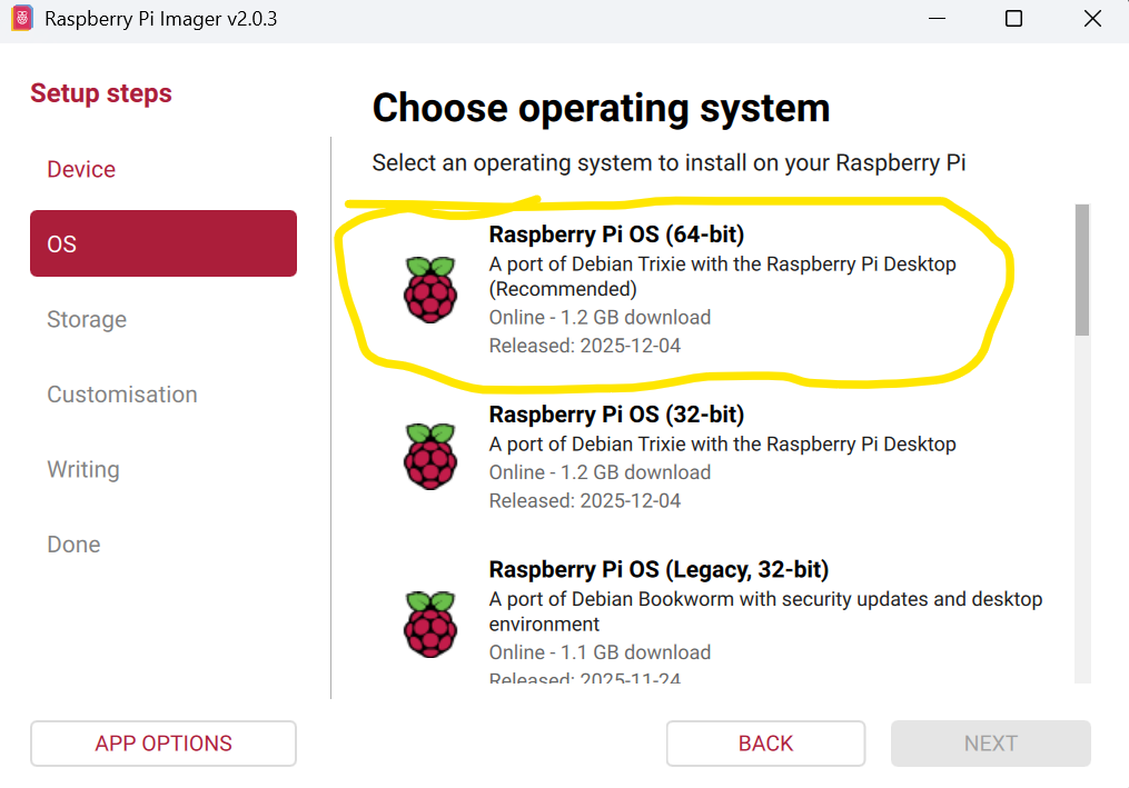 - Choose OS: Click "CHOOSE OS" and select the recommended Raspberry Pi OS (64-bit).