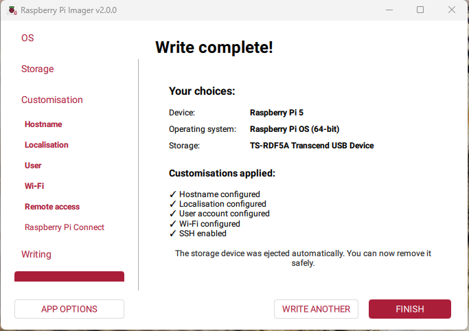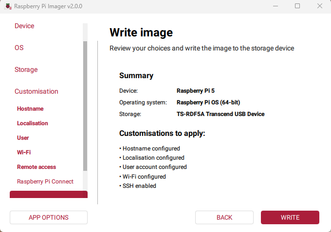 Once configured, click SAVE, then click WRITE. Confirm that you want to erase the SD card. The Imager will now download the OS and write it to the card. This may take a few minutes.