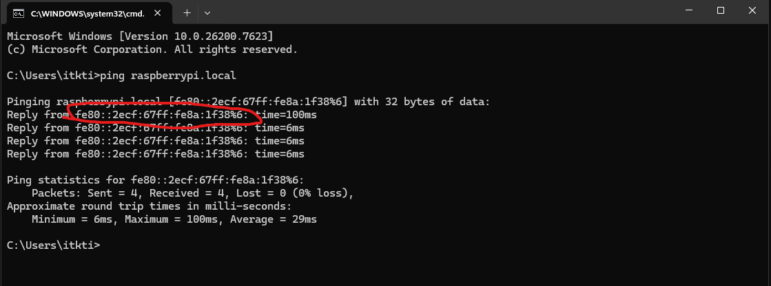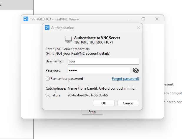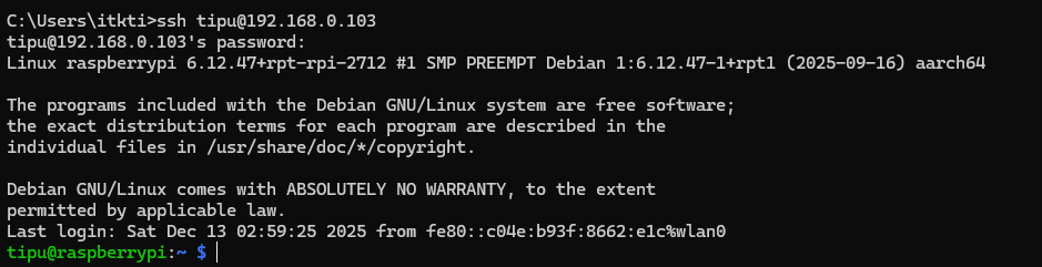 usernamewith the user you created andYOUR_PI_IPwith the IP address you found in Step 3:ssh username@YOUR_PI_IP(Example:ssh tipu@192.168.0.105) - Type "yes" if asked to continue connecting.