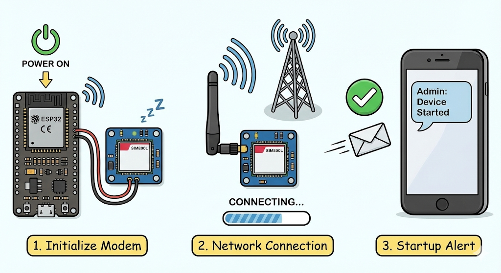 In the setup() function, we don't just turn the device on; we prepare the SIM800L for reliable communication.