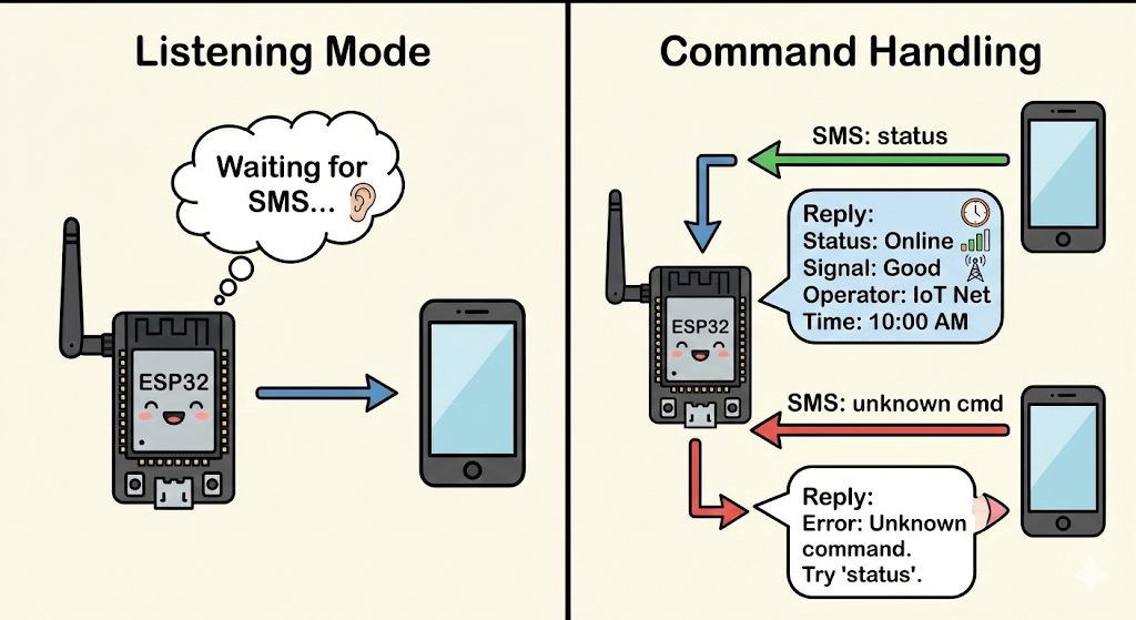 - Listening Mode: The device enters a loop where it waits for incoming SMS messages.