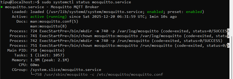 mosquitto: This is the MQTT broker itself.mosquitto-clients: These are command-line utilities for testing, likemosquitto_pubandmosquitto_sub.