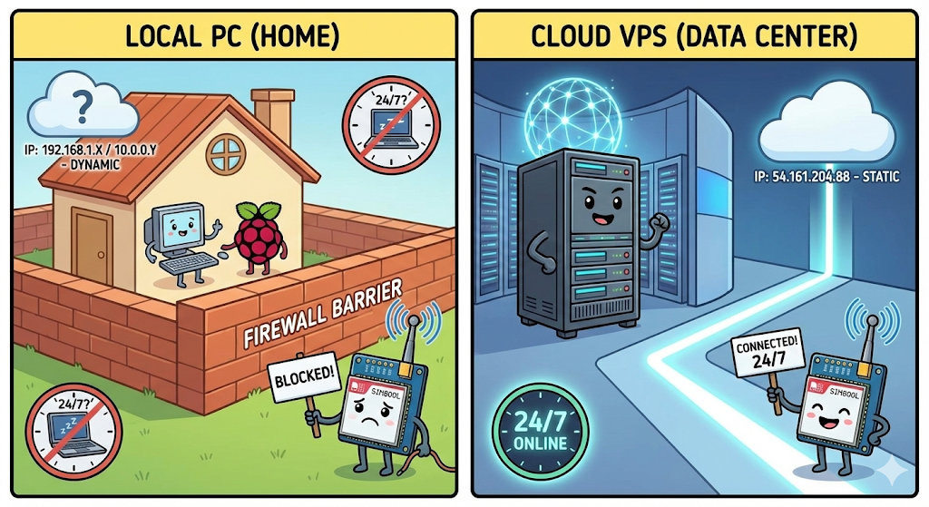 - Static vs. Dynamic IP: Your home internet IP address changes frequently. A VPS provides a Static IP that never changes, so the SIM800L always knows where to send data.