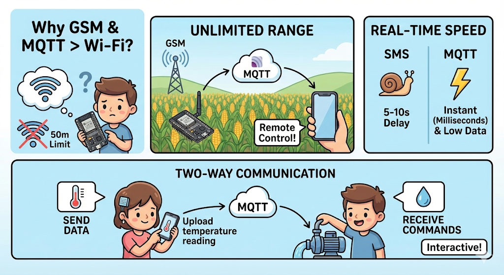 The combination of GSM (Cellular) and MQTT (Lightweight Messaging) unlocks capabilities that Wi-Fi simply cannot offer: