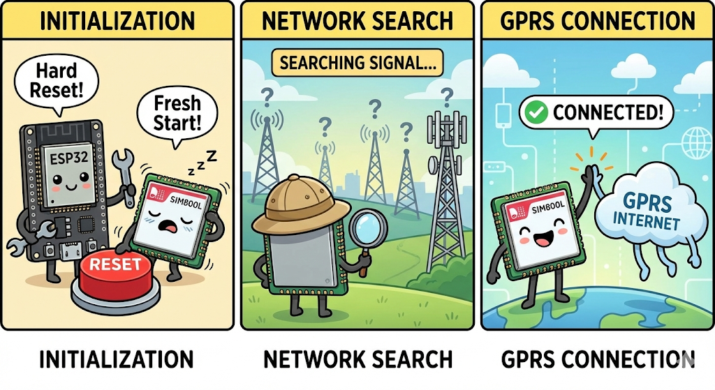 - Initialization: When the ESP32 powers on, it first performs a "Hard Reset" on the SIM800L (toggling the RST pin) to ensure the modem is fresh and ready.
