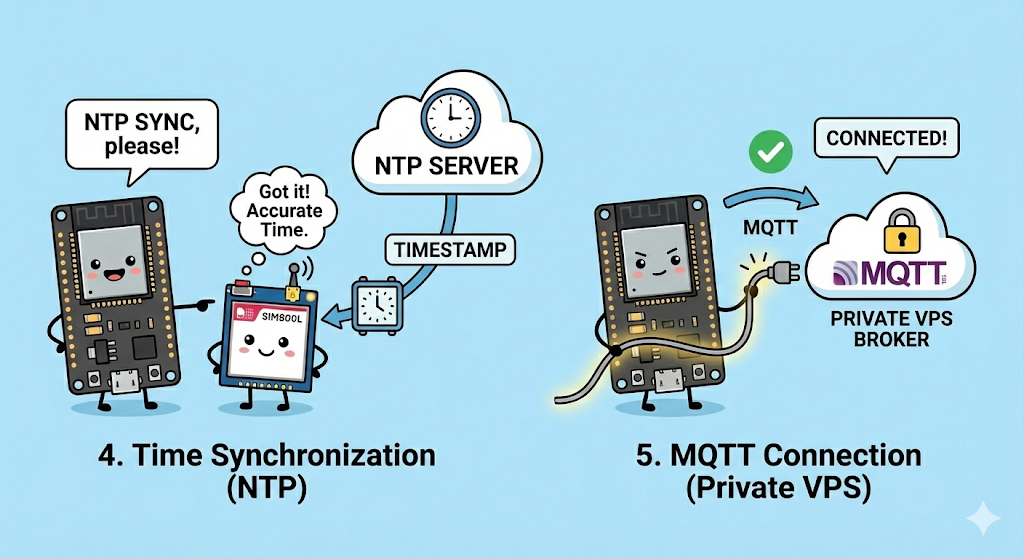 - Time Synchronization (NTP): This is a crucial step. Since the SIM800L doesn't have an internal battery to keep time, we ask the modem to sync with an NTP Server. This ensures our data points have an accurate "Timestamp" when they reach the dashboard.