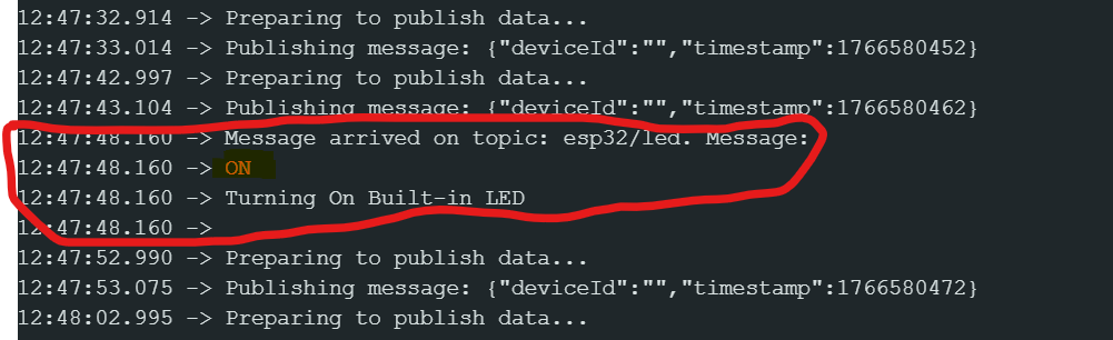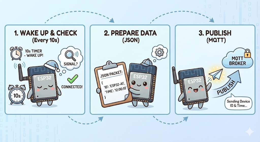 - The Loop (Heartbeat): Every 10 seconds, the device wakes up, checks if the connection is still alive, and publishes a JSON packet containing its Device ID and Current Time.