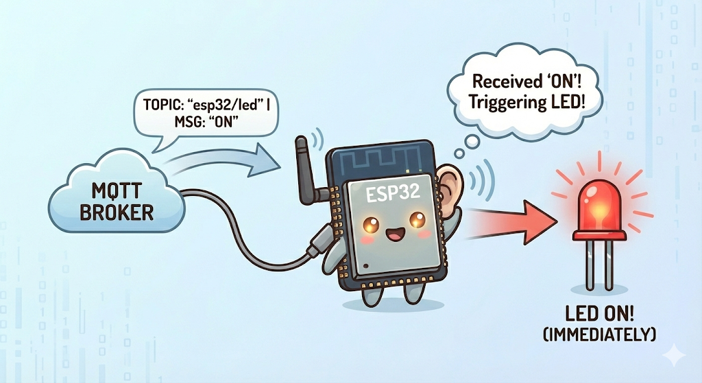 Result: Look at your hardware setup. The Blue LED should turn ON instantly! Send OFF to turn it back down.