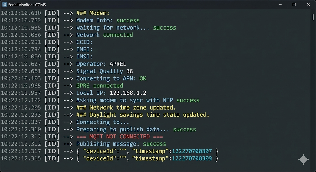 When your code uploads successfully, open your Serial Monitor (baud rate 115200). You should see the modem initializing, syncing time (NTP), and finally publishing the JSON data successfully like this: