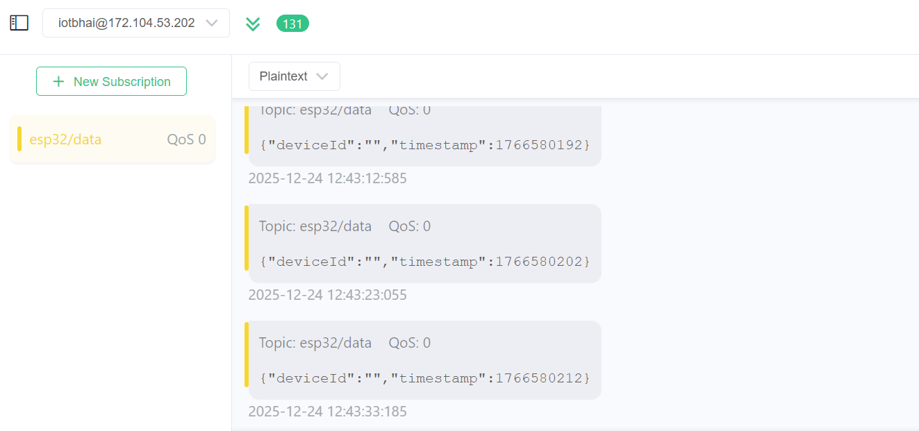 2. Receiving Data (Subscriber Mode) Now, let's see the data coming from the ESP32. We need to "Subscribe" to the topic the ESP32 is talking on.