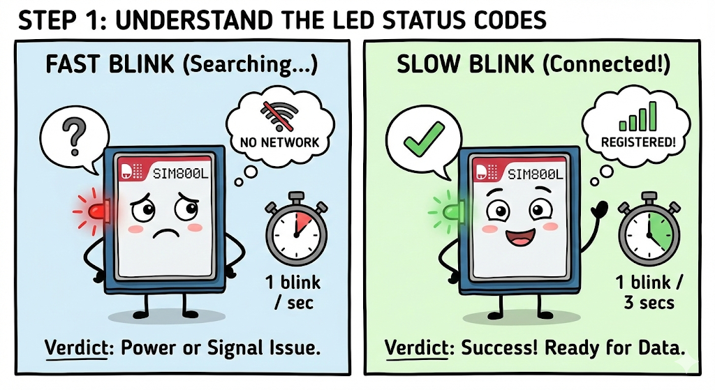 Before you blame your code or your microcontroller, look at the LED on the SIM800L. It tells you exactly what is happening.