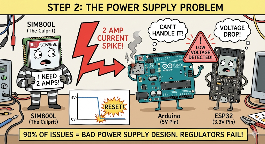 Most microcontroller regulators cannot handle that 2A spike fast enough. The voltage drops, the SIM800L detects "low voltage," and it shuts down or resets immediately.