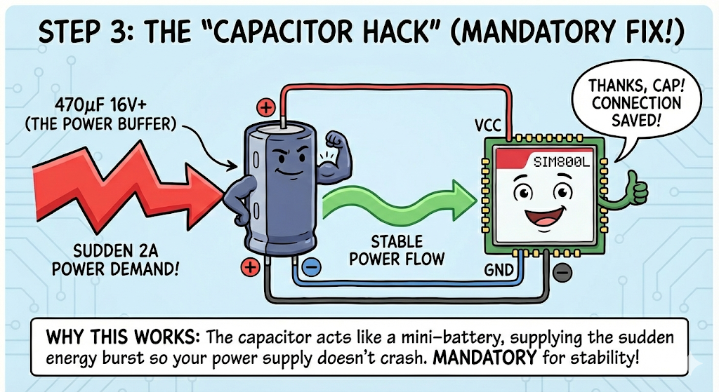 Why this works: When the module demands that sudden 2A burst, it pulls energy from the capacitor instead of crashing your power supply.