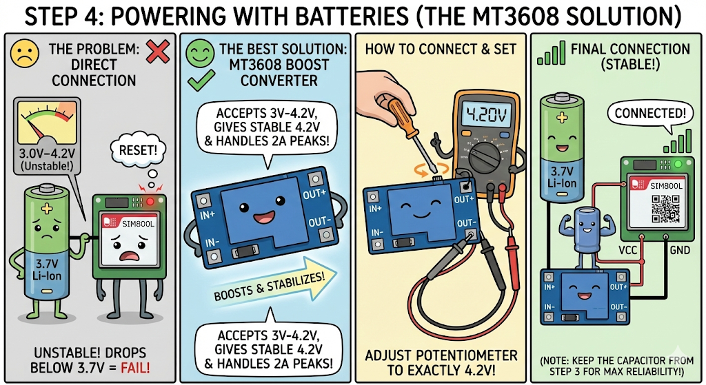 The Problem with Direct Battery Connection: Many beginners try to connect a standard 3.7V Li-Ion or Li-Po battery directly to the SIM800L. While this can work temporarily when the battery is fully charged (around 4.2V), it quickly becomes unstable. As the battery drains and its voltage drops below 3.7V, the SIM800L will fail to connect or will constantly reset under load.