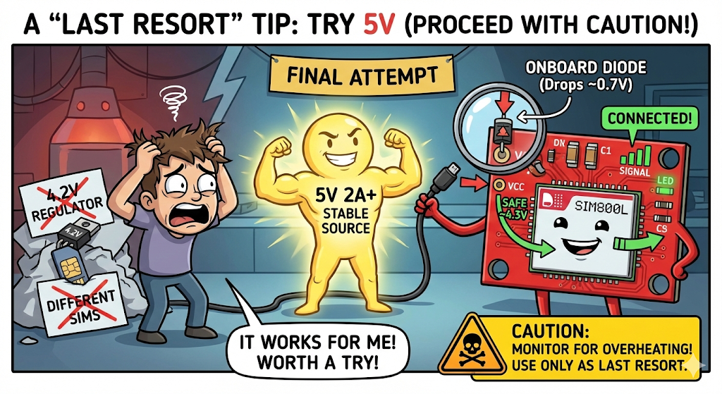 If you have tried absolutely everything above—the capacitor, the regulated 4.2V source, different SIM cards—and it still won't connect, here is one final thing to try.